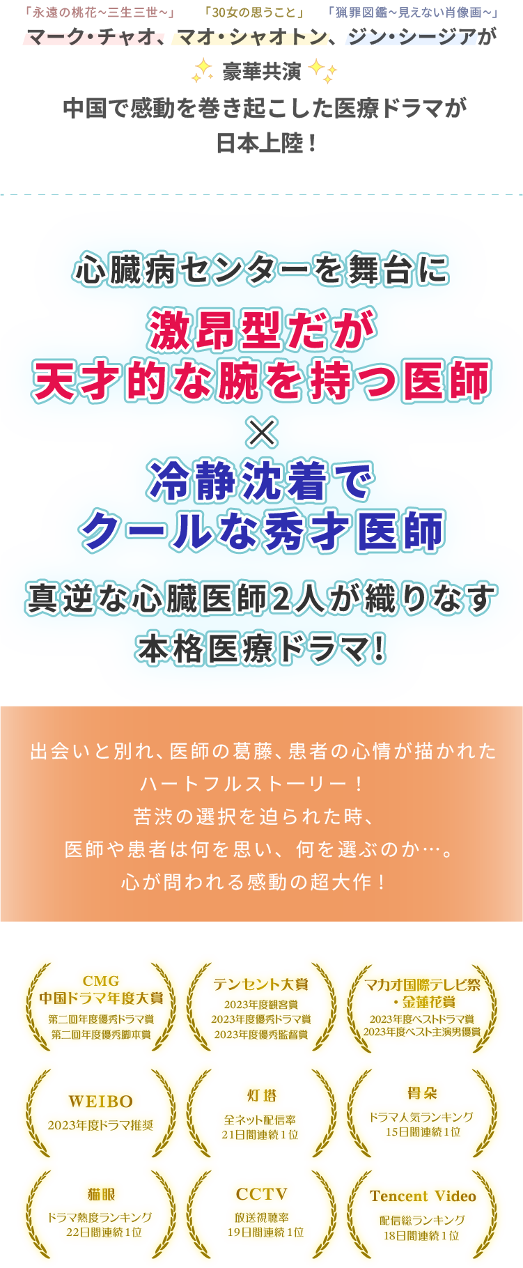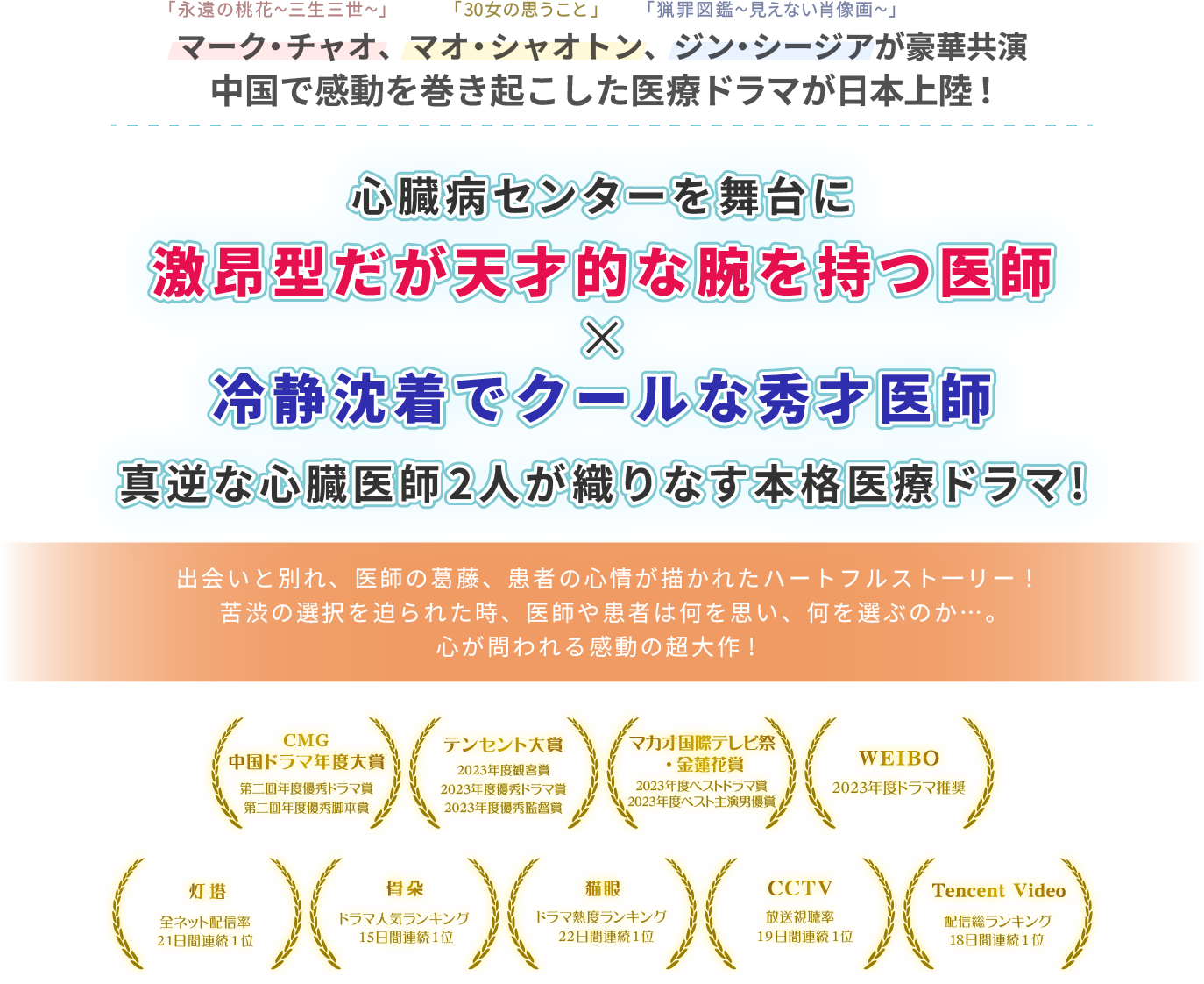 優秀だが性格に難ありの心臓外科医リン・イーは、師匠の推薦で東立病院に新設された心臓病センターに赴任。冷静かつ慎重な心臓内科医のジョウ・シャオフォンと冠動脈チーム内でのパートナーとなった。2人の天才が競い合い、連携し合う中で、人を治しつつ、自分自身も癒していく物語。第1話 良心への問いかけ
